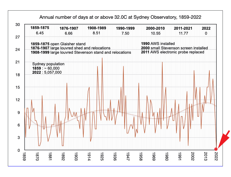 11. Nonostante l'inattendibilità dei dati, il 2022 è stata la prima volta in 162 anni che la stazione meteo di Observatory Hill di Sydney non abbia mai rilevato un solo giorno sopra il 32 °C, fermandosi a 31,9 °C, quando il massimo registrato in passato è stato 45,8 °C.