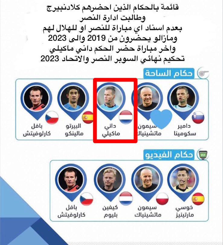 الحكم الهولندي داني ماكيلي هو الذي حكم نهائي السوبر ،، وانتهت بفوز #الاتحاد بهدفين غير صحيحين ، ايضا لاول مرة يكون فيها كاس للهداف من اجل ان يمنحوه حمدالله نكاية في النصر