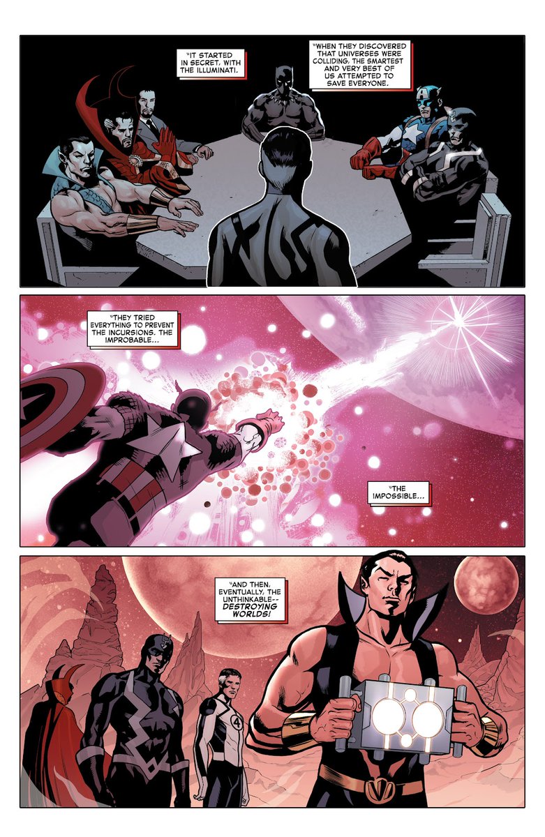الحدث الاكبر في مارفل لا يمكن لي ان اوصف الابداع في هذه القصة و ظهور كل شخصيات مارفل او تقريباً يمكن القول 90 بالمية منها فهو حدث ذو نطاق واسع ليس للارض فقط بل للاكوان كلها ففكرته هو شي يدعى incursion هو حدوث تصادم بين ارضِ من كونين مختلفين...يتبع