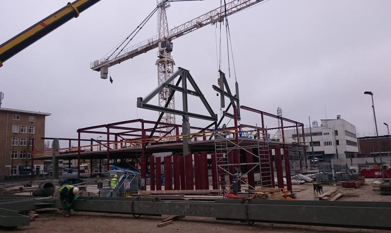 تم استخدام رافعات قادرة على نقل وتجميع هذه الجمالونات بطول 32م وارتفاع 6م ووزنها 90 طن تم تقسيمها الى 3 عناصر ،واخذ بالاعتبار تأثير القوة في الجمالونات وأبعاد النقل. ولمقاومة #الديفلكشن او الترخيم تم نصب الجملونات على طول الكابول 16 متر وعلى عرض المبنى 45 متر،