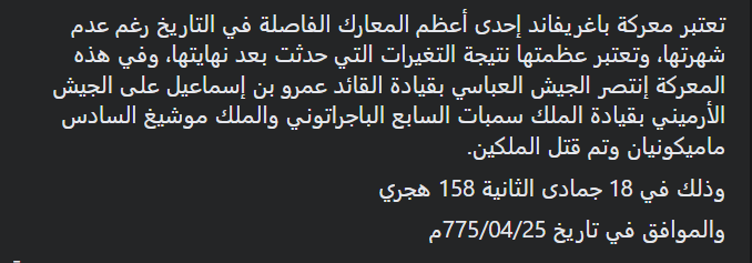 العباسي بأداء صلاة الفجر بدأ هجوم الجيش الأرميني، ولكن الجيش العباسي صدهم وإستطاع أن يشن هجوم مضاد، ودمر الجيش العباسي قسم المشاة والرماة في الجيش الأرميني وأما قسم الفرسان الأرميني فقد صمد طويلا إلى أن تم القضاء عليه، وتم قتل ملوك وقادة الأرمن وأهمهم
