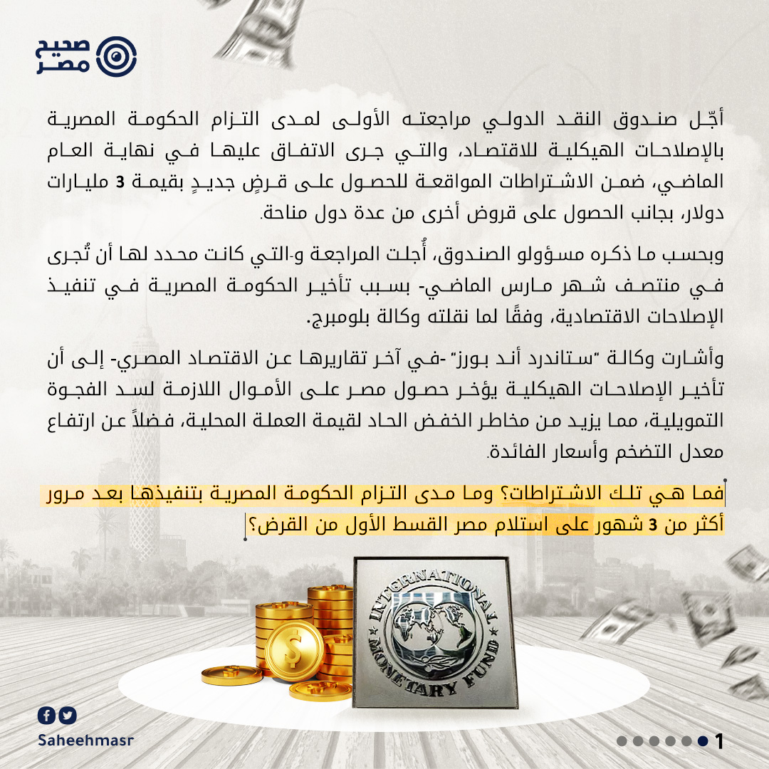 ❓ فما تلك الإصلاحات؟ وما مدى التزام الحكومة المصرية بتنفيذها بعد مرور أكثر من 3 شهور على استلام مصر القسط الأول من القرض؟