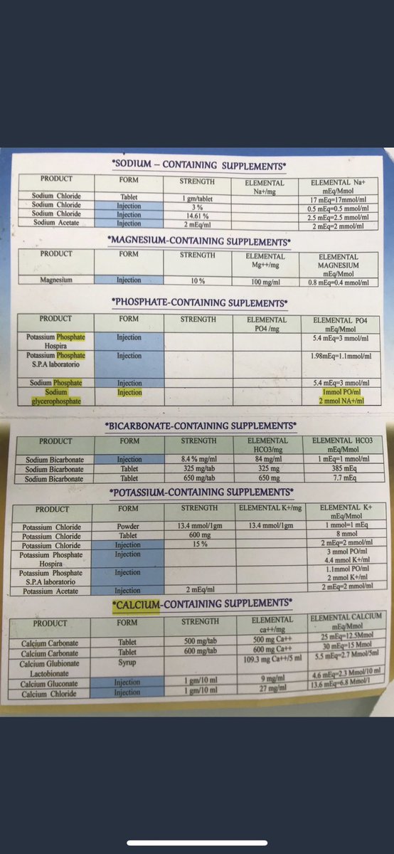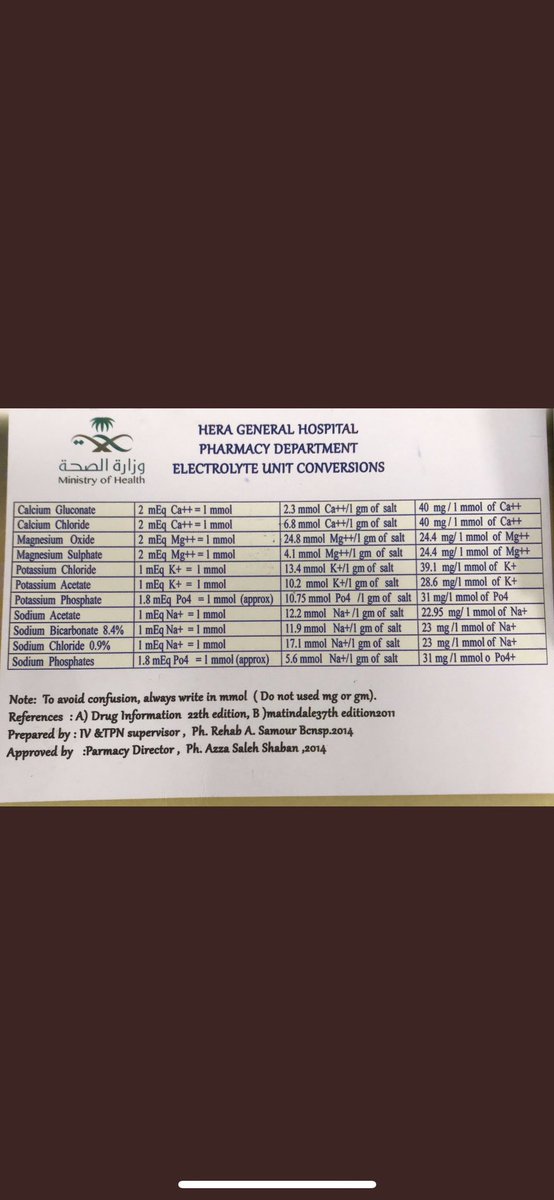 1-الإلكترولايت .. تشمل كل من magnesium/ phosphate / potassium و غيرهم ،، و لكل منهم دور مهم و تراكيز مختلفه و تصرف بشكل كبير في العنايه المركزه