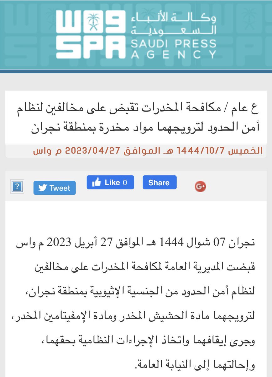 🚨🚨المديرية العامة لمكافحة المخدرات تقبض على مخالفين لنظام أمن الحدود من الجنسية الإثيوبية بمنطقة نجران، لترويجهما مادة الحشيش المخدر ومادة الإمفيتامين المخدر، وجرى إيقافهما واتخاذ الإجراءات النظامية بحقهما، وإحالتهما إلى النيابة العامة.