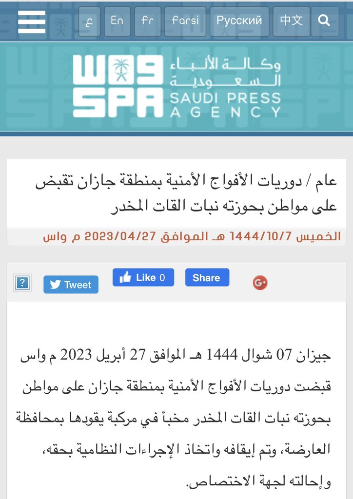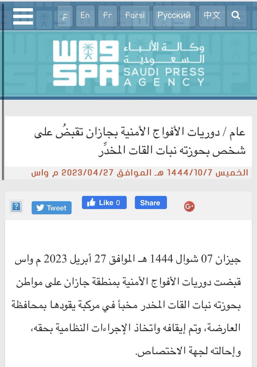 🚨🚨قبضت دوريات الأفواج الأمنية بمنطقة جازان على مواطن بحوزته نبات القات المخدر مخبأ في مركبة يقودها بمحافظة العارضة، وتم إيقافه واتخاذ الإجراءات النظامية بحقه، وإحالته لجهة الاختصاص.