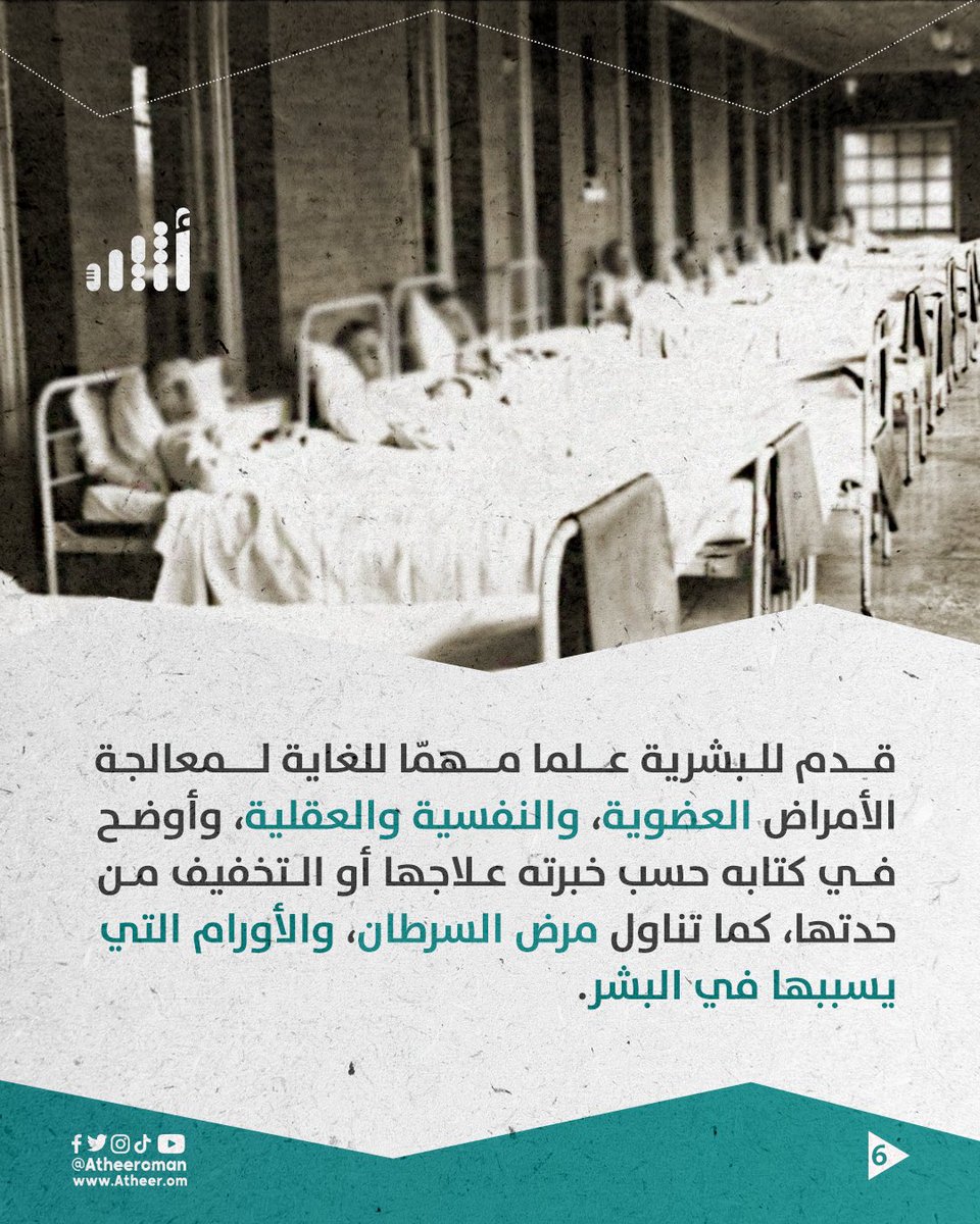 #أثير| قدّم للبشرية علما مهمّا للغاية لمعالجة الأمراض العضوية، والنفسية والعقلية، وأوضح في كتابه حسب خبرته علاجها أو التخفيف من حدتها، كما تناول مرض السرطان، والأورام التي يسببها في البشر.