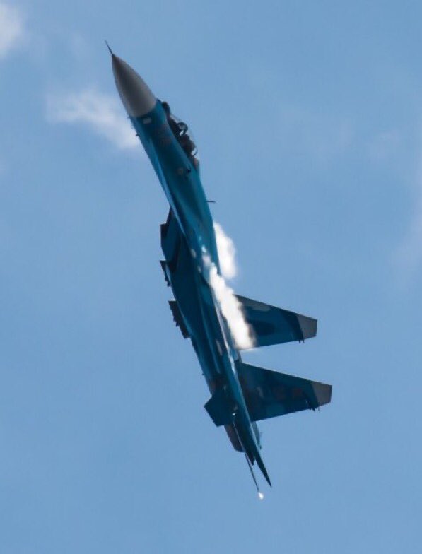 4/ Lasciando a bocca aperta il pubblico, all’improvviso mandò in stallo il suo fido Sukhoi Su-27, puntando il muso in alto con un angolo d’attacco tra i 90 e 120 gradi. Senza guadagnare ne perdere quota, bensì riducendo la propria velocità praticamente allo zero.