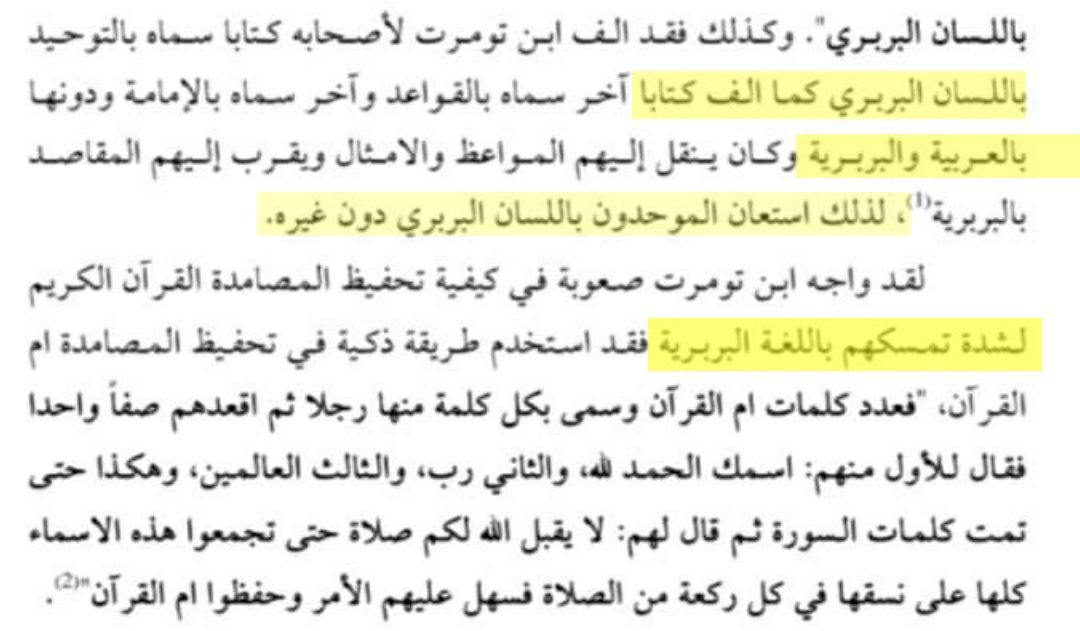 ▪︎فقد استعان الموحدون #باللسان_الامازيغي (البربري) دون غيره بل صاحب الموحدين بن تومرت المسمى بالمهدي ، الف كتبه #بالأمازيغية ، و كما هو معلوم الامازيغ من شدة تعصبهم للغتهم صعب عليهم حتى حفظ القرآن ، فكانت معالم الامازيغية كلغة وا١حة في الإمبراطورية الموحدية حتى داخل البلاط.