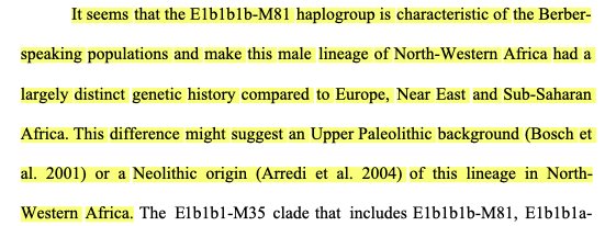 و نُذَكِّر أن M81 تحور أصيل في المغرب و متعلق بالأمازيغ حسب العديد من الدراسات و نذكر منها دراسة R.Ben El Haj et al.2017 حيث أكدت أصالة التحور M81 في الشمال الإفريقي و وصفه بالتحور الأمازيغي