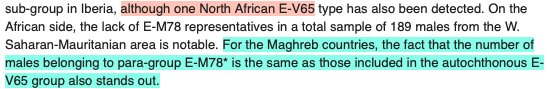 أما بالسبة للسلالة E-M78 الشمال إفريقية الأصل، فالساكنة المغاربية تتكتل أساسا تحت التحور E-V65 منها و الذي يرتبط بجماعات موروثها لواتي أمازيغي.