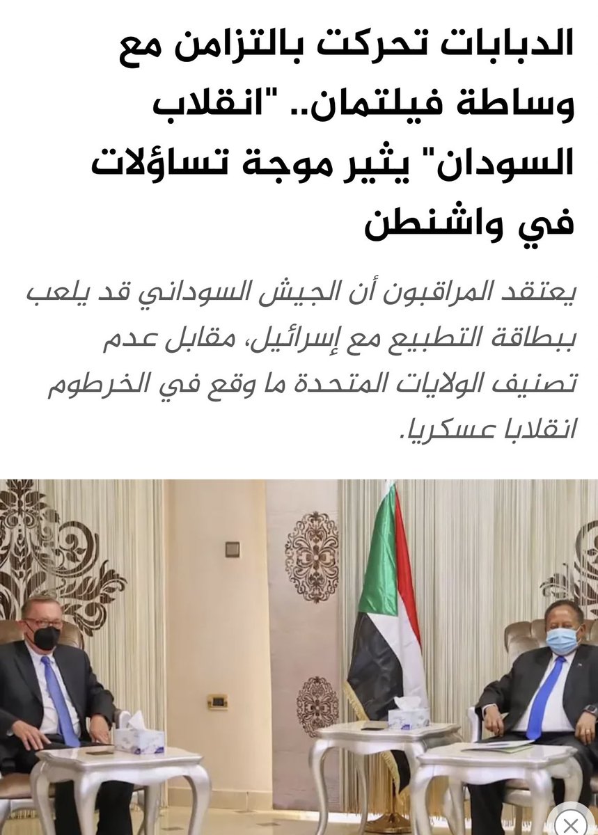 و هو في الواقع تصريح بحل السودان كدولة و جيش و شعب وحدود سياسية ووحدة وماضي و مستقبل! فيلتمان ببساطة يصرح علنا انه يجب ان يختفي كل من البرهان وحميدتي من المشهد وهما شريكي الصراع الاساسين و هذا ينطوي بالطبع على التخلص منهما، وفي هذه الحالة من التصعيد ، كلامه يحمل معنى واحد