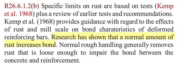 يؤدي الصدأ لتتكون طبقة #خشنة #ضعيفة بين حديد التسليح والخرسانة أثبتت الدرسات أن تكون طبقة سطحية من صدأ الحديد 1.7% تزيد من قوة الترابط(bond) بشكل ملحوظ