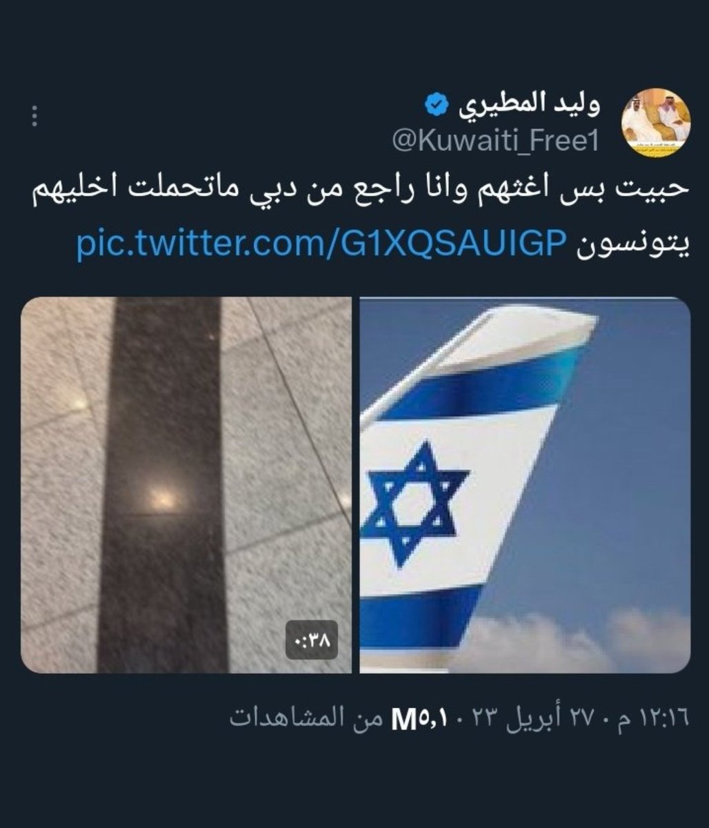 قبل فترة بسيطة صور مغرد كويتي يدعى وليد المطيري هتافه لفلسطين أمام عائلة اسرائيلية في مطار دبي..