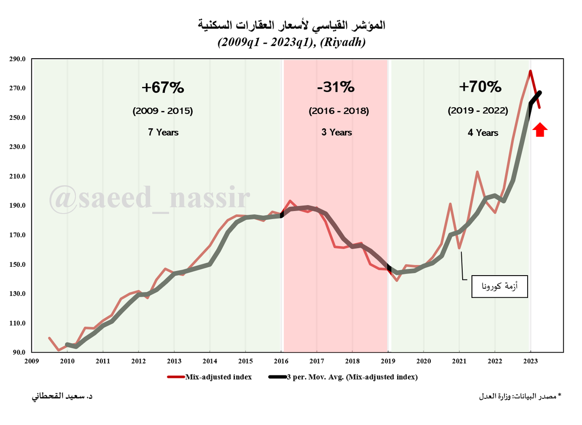 2⃣ في البداية، استخدمت بيانات وزارة العدل ونشرت دراسة علمية صممت فيها مؤشرات عقارية متطورة لأول مرة على مستوى السوق العقاري السعودي بنفس طريقة مؤشر Case-Shiller للعقارات السكنية الأمريكية. واليوم سوف اتحدث من واقع خبرتي في هذا المجال عن أسعار العقارات السكنية في 🇸🇦