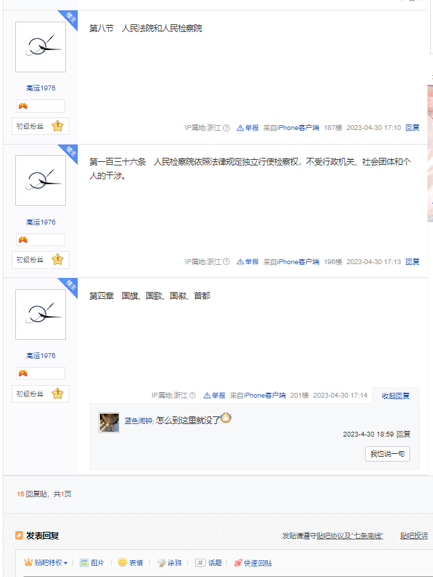 一位楼主在百度贴吧逐条发布宪法内容,测试《宪法》在百度贴吧里能显示出多少条。
