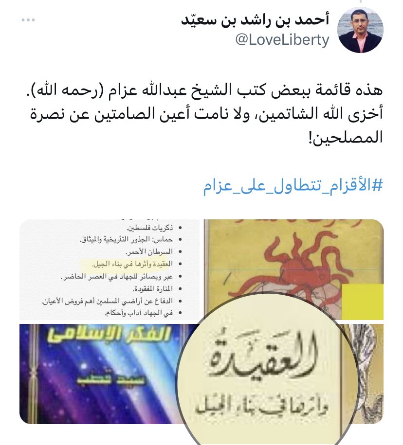5️⃣ يأتي ويبيع تطرفه فقط على السعوديين، مثلًا ينصح بالكتب التي يعتبرها جيّدة، ويظهر من بينها كتاب (العقيدة وأثرها في بناء الجيل) للإخواني عبد الله عزام👇