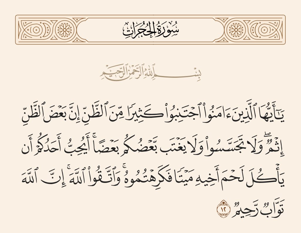 قال الله تبارك وتعالى في سورة النور: ( لَوْلا إِذْ سَمِعْتُمُوهُ ظَنَّ الْمُؤْمِنُونَ وَالْمُؤْمِنَاتُ بِأَنفُسِهِمْ خَيْرًا وَقَالُوا هَذَا إِفْكٌ مُّبِينٌ ).