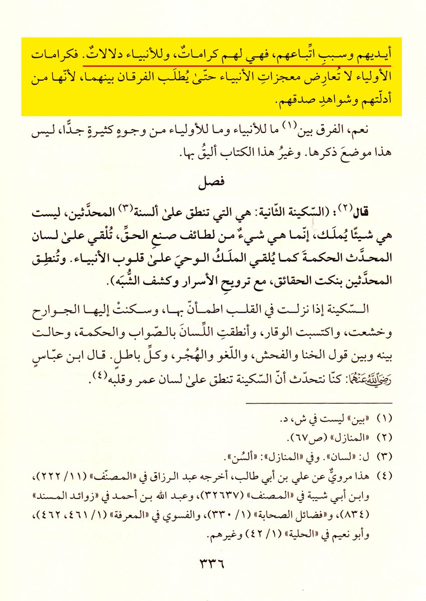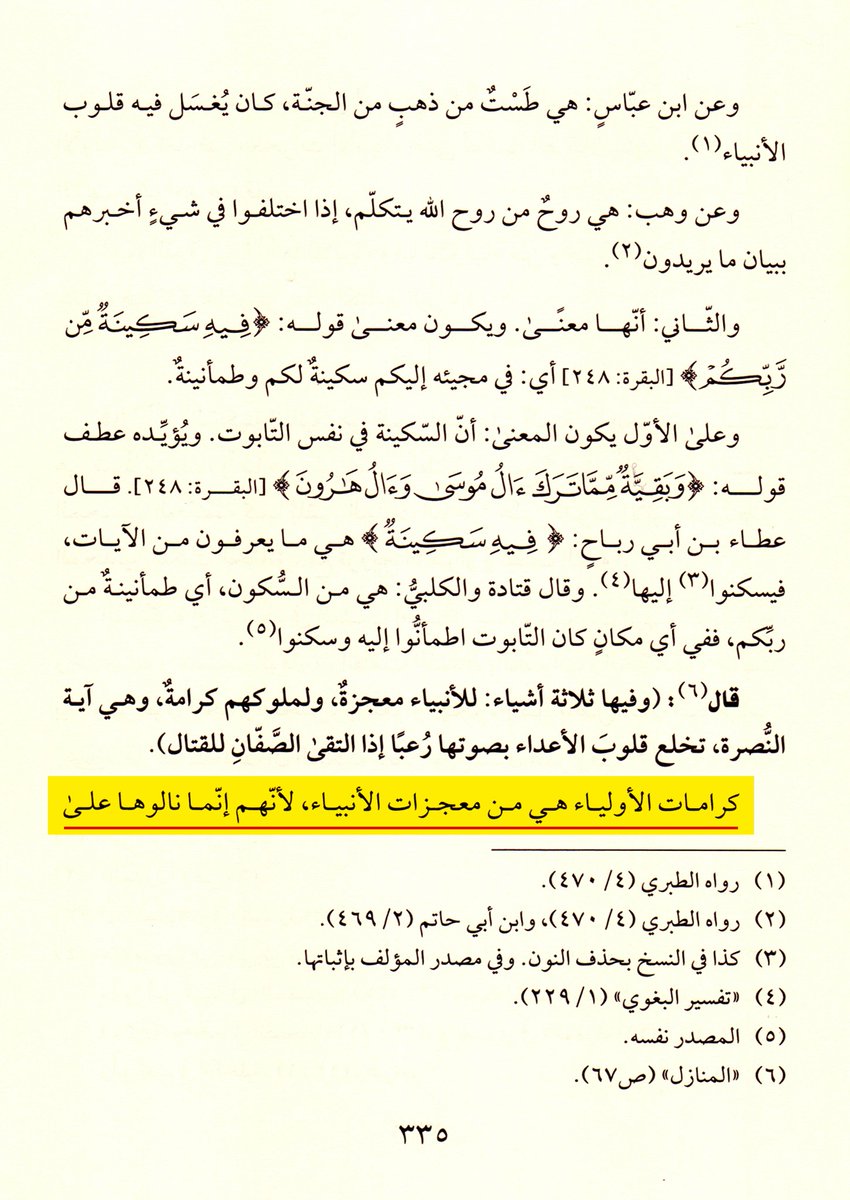 (كرامات الأولياء هي من معجزات الأنبياء، لأنهم إنّما نالوها على أيديهم وسببِ اتِّباعهم، فهي لهم كراماتٌ، وللأنبياء دلالاتٌ. فكرامات الأولياء لا تُعَارض معجزات الأنبياء حتى يطلب الفرقان بينهما ...). 👇🏻