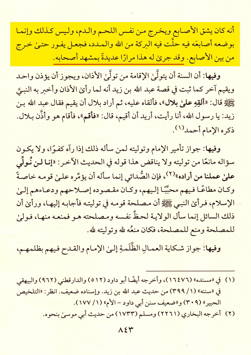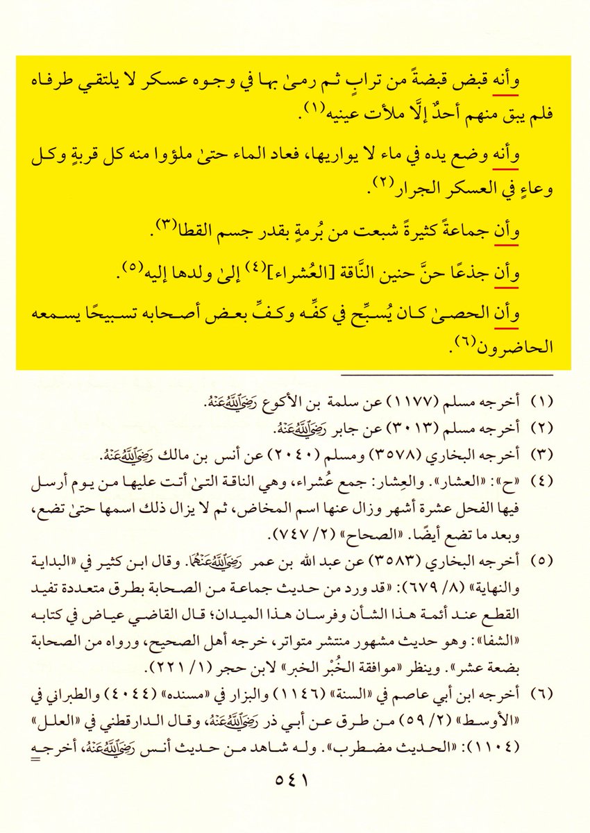 (وفيها: المعجزة الظاهرة بفَوَران الماء من بين أصابعه؛ لمَّا وضعها فيه أمدَّه الله به وكثَّره حتى جعل يفور من خلال الأصابع الكريمة ... وقد جرى له هذا مراراً عديدة بمشهد أصحابه). 👇🏻