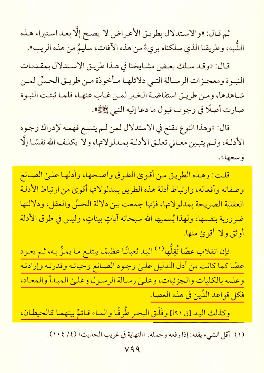وقال عن عصا موسى: (وكان إلقاءُ العصا وانقلابها حيَّةً هو البيِّنة). 👇🏻