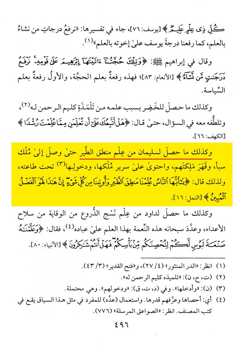 (وكذلك ما حصلَ لسليمان من عِلْم منطق الطَّير حتى وصلَ إلى مُلْك سبأ، وقَهَرَ مَلِكتَهم، واحتوى على سرير مُلْكها، ودخولها تحت طاعته، ولذلك قال: {يا أيها الناس عُلِّمنا منطق الطير وأوتينا من كل شيء ...}). 👇🏻