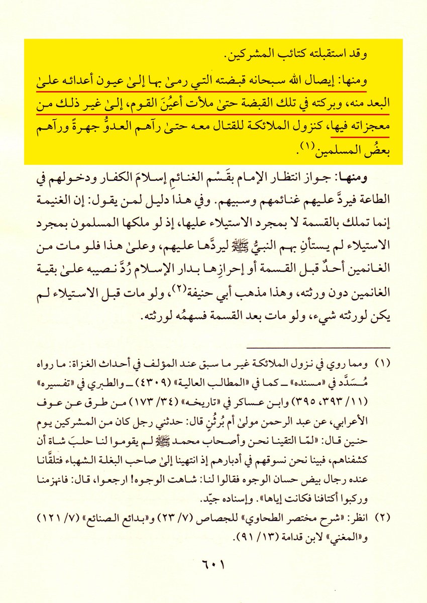 (ومنها: ما ظهر في هذه الغزاة من معجزات النبوة ... ومنها: إيصال الله سبحانه قبضته التي رمى بها إلى عيون أعدائه على البعد منه، وبركته في تلك القبضة حتى ملأت أعين القوم، إلى غير ذلك من معجزاته فيها). 👇🏻