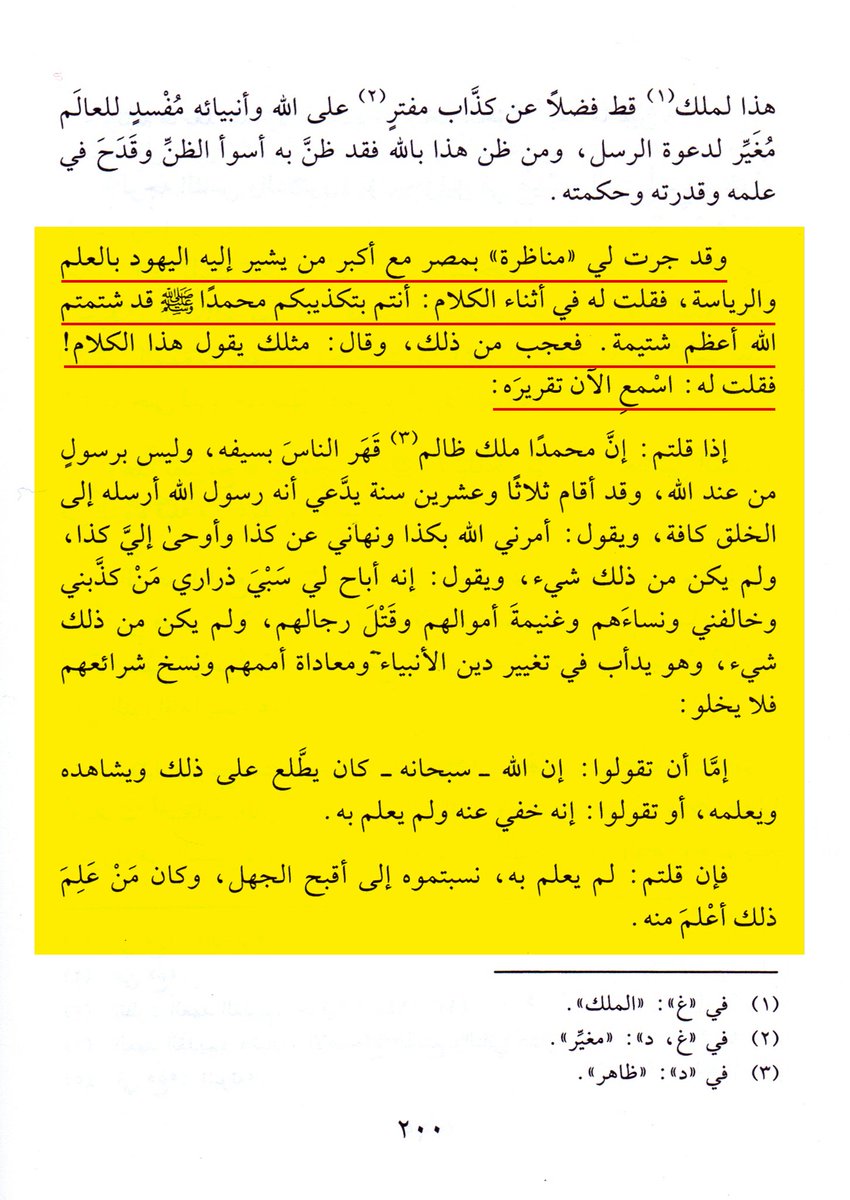 ١٠- ذكر ابن القيم في كتابه (هداية الحيارى في أجوبة اليهود والنصارى) مناظرة له مع أحد علماء اليهود، وقد احتج فيها بأدلة كثيرة على نبوة محمد صلى الله عليه وآله، ومنها المعجزات، قال: