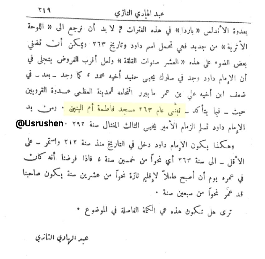 ▪︎#الدرس_العاشر و يتكلم عبد الهادي التازي المؤرخ المغربي عن اللوحة الشهيرة التي وجدت بالقرويين و تؤكد ان الذي امر ببناء الجامع للمصلين هو #داود_بن_دريس! و لا يعلم أحد من اين جاؤوا بخرافة فاطمة الفهرية هذه التي يستغلها بعض السذج و يصدقها المغاربة بصفر بحث !