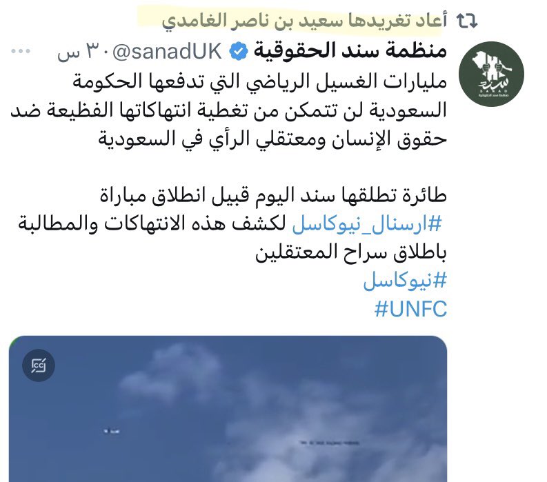 1️⃣ فرح مشردو لندن باستئجارهم طائرة لكي تطير فوق مباراة أرسنال-نيوكاسل، لتهاجم السعودية زورًا، سعيد بن ناصر هلل على الإنجاز الضخم! الذي سخر منه العديد من البريطانيين، لكن ما هي منظمة سند هذه؟