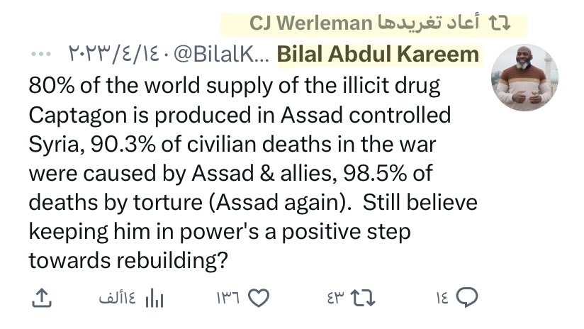 6️⃣ نوعية الشخصيات التي يعتمدها ويعيد التغريد لها مثيرة للفضول نوعًا ما، بلال عبد الكريم، ناشط في مجال تلميع هيئة تحرير الشام، التي هي جبهة النصرة التي هي داعش قبل الانشقاق.