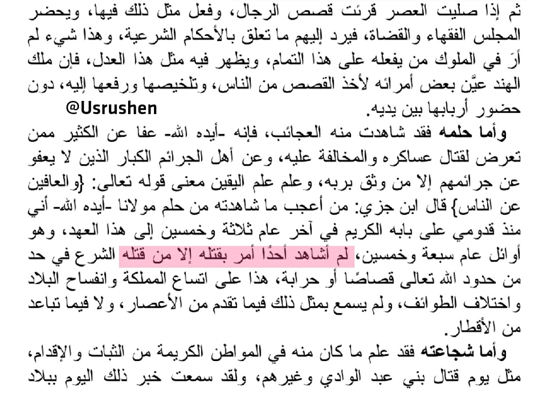 ▪︎و يركز ابن بطوطة وصف #عدل السلطان المريني المغربي بانه لم يكن يحب سفك الدماء (و هذا معروف عن مشيخة بني مرين الزناتيين فهم لا يحبون سفك الدماء ، باستثناء ما يتعلق في أمور الفسد خاصة مع الاعراب) ، فيقول "" لم أشاهد أحدا أمر بقتله إلا من قتله الشرع في حد من حدود الله تعالى"" .