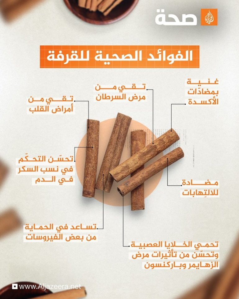 الحماية من الالتهابات: يحتوي لحاء القرفة على مواد تساعد في الحد من التهابات الجهاز التنفسي والأمعاء، وتحسين صحة الجهاز المناعي.