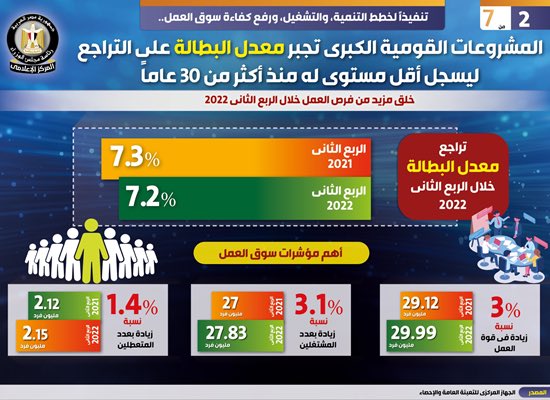 بينما بلغ عدد المشتغلين 27.83 مليون فرد في الربع الثاني عام 2022،