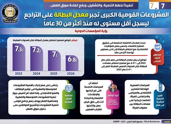 لها منذ أكثر من عقد،كما توقع يصل معدل البطالة في مصر خلال عام2023 ل6.9%، مع استمرار انخفاض معدلات البطالة خلال ٥ سنين لتصل ل6.4% عام 2027