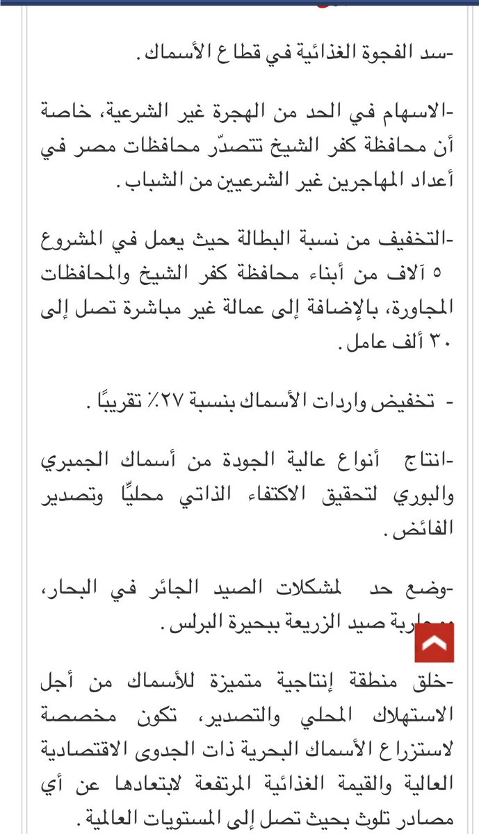 تصل إلى 30 ألف عامل، كما يساهم المشروع بإنتاجيته في تخفيض واردات الأسماك بنسبة 27% تقريبًا ، ودا بفضل انتاج المشروع لأنواع عالية الجودة من أسماك الجمبري والبوري؛ لتحقيق الإكتفاء الذاتي محليًا وتصدير الفائض، والعمل على رفع القيمة الإنتاجية للإستزراع السمكي،