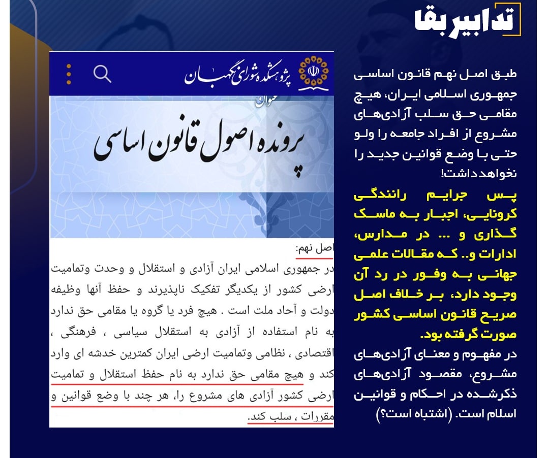 برای مثال مردم بایدبدانندکه: #طبق_اصل_نهم_قانون_اساسی جمهوری اسلامی ایران هیچ مقامی حق "سلب آزادی های مشروع ازافرادجامعه را ولوحتی باوضع قوانین جدیدی،را نخواهدداشت"⬇️