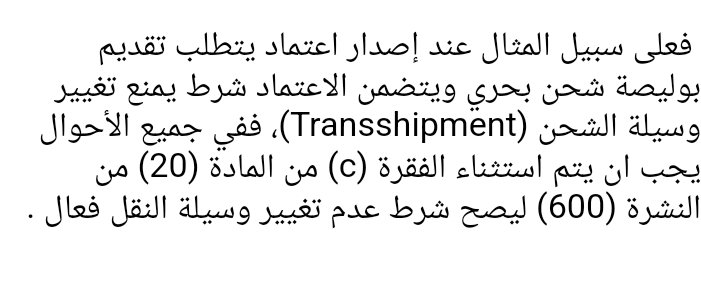فى شرط مكتوب فورا ( بوالص الشحن متعدد الوسائط غير مقبولة ) يعنى العميل والبنك والمصدر والمستورد عاوزين نقل البضاعة يكون مباشر من ميناء شنغهاى الى الاسكندرية ولو قلت لهم بالمستندات انا هانقل بمركب وقطر هايقولك اسف الاعتماد مرفوض لان المخاطر والتكلفة بتزيد ودة شرط مكتوب بكل اعتماد