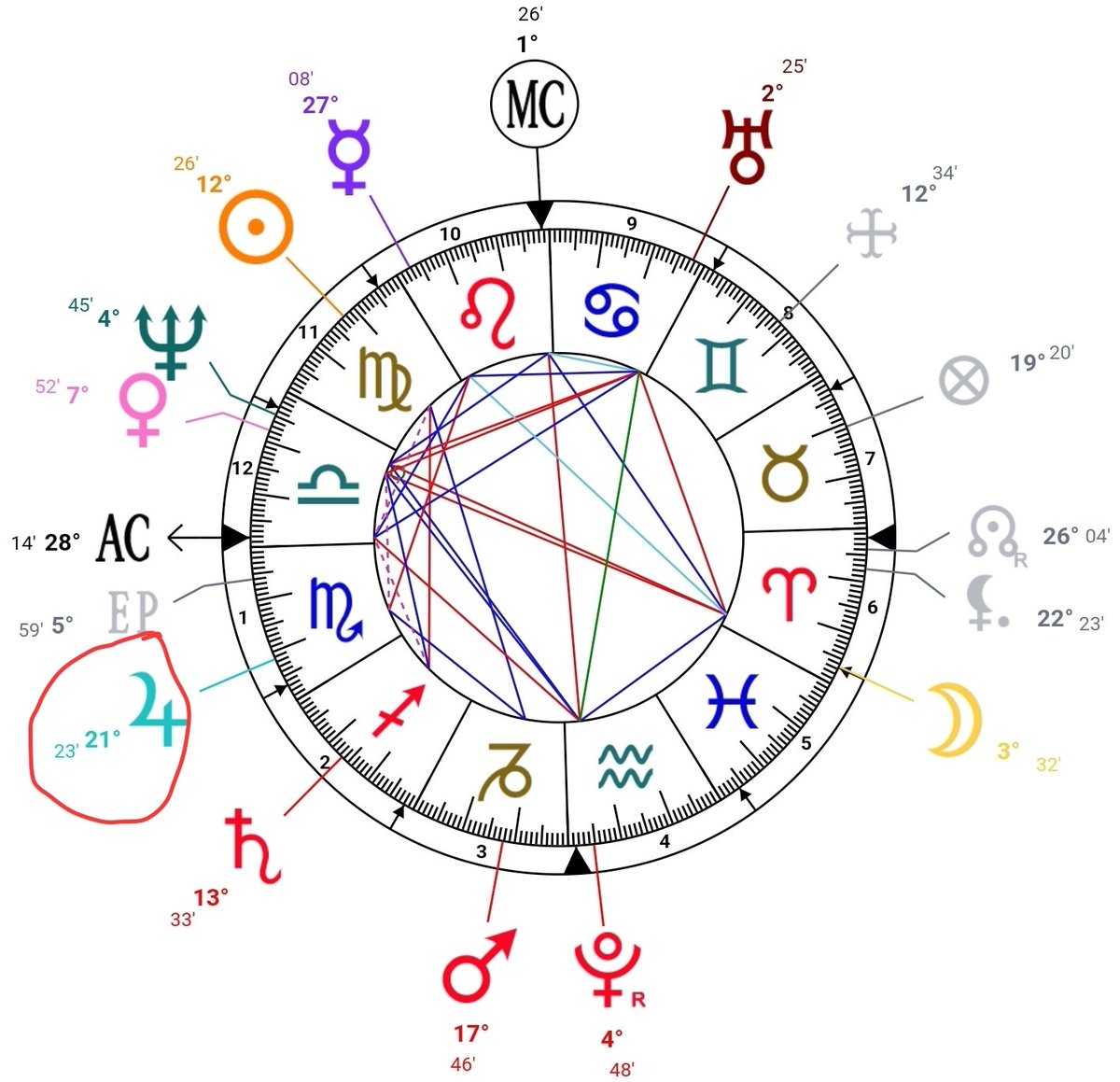 نرى فيها طالعه العقرب ويقترن به المشتري ( الدرجات الميته) والمشتري حاكم الثاني والخامس وهو غريب بالعقرب يقترن بنجم اسمه المياه الهادئة لذا فهو من ادلة ادمانه للمخدرات ( الخامس السعادة والثاني عن طريق الفم او طرق اخرى تسبب النشوة والسعادة )