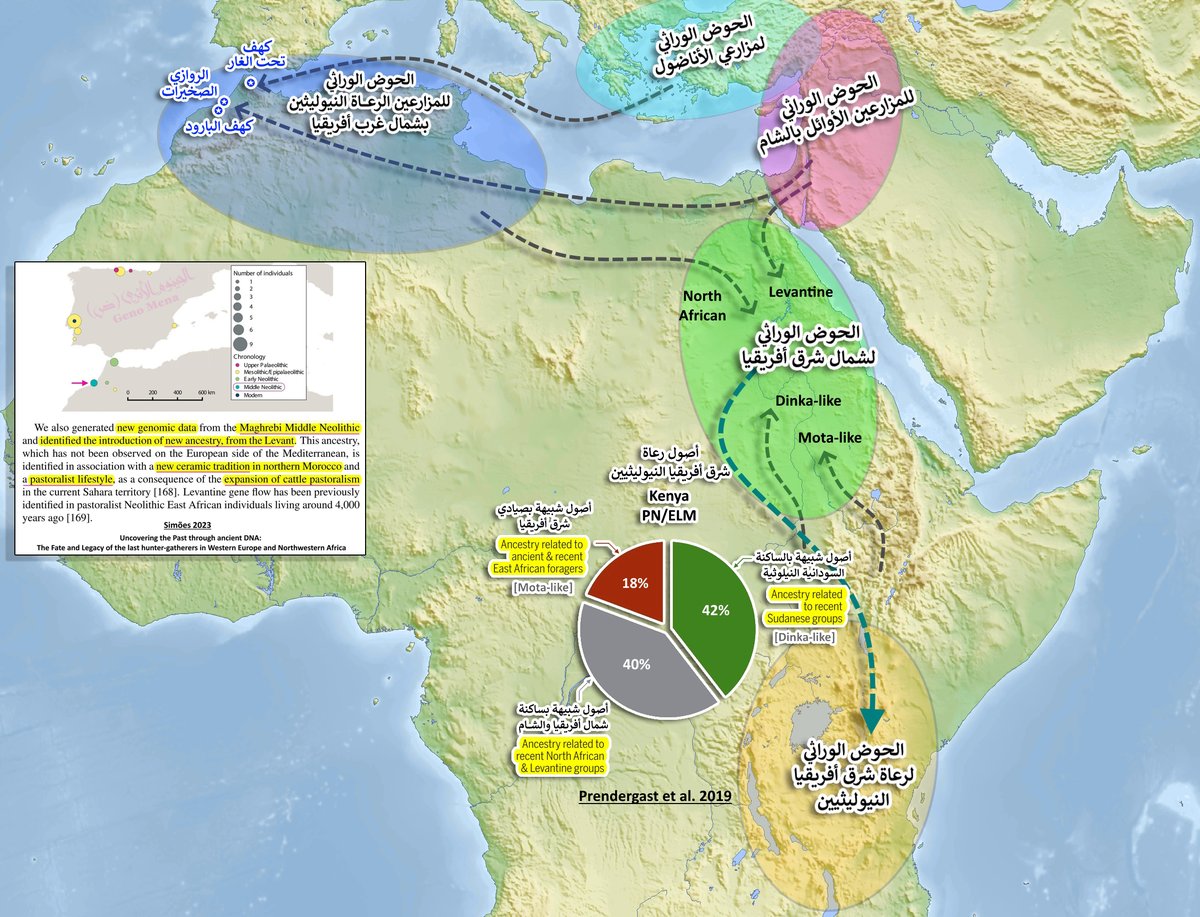 ثريد متكامل لكشف محاولات التضليل وتحريف مضمون الدراسات⛔️ يلزم هنا الانتباه إلى أن الأصول الشامية بعينات المغرب النيوليثية الوسيطة بموقع الصخيرات حسب أطروحة Simões 2023 هي ليست الحوض الوراثي لشمال شرق أفريقيا حسب دراسة Prendergast et al. 2019 والمتعلقة برعاة شرق أفريقيا