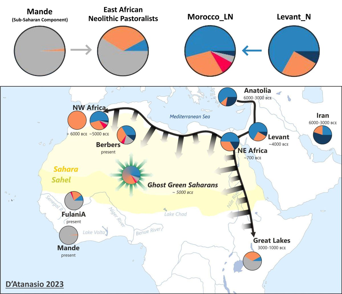 صفعة من دراسة Pfennig 2023 التي فصلت بين الهجرتين 👈موجة الانتقال النيوليثي Neolithization بين 7.500-5000 سنة ومصدرها غرب آسيا والمتوسط 👈هجرة الرعاة الأفارقة منذ 4000 سنة ومصدرها شمال شرق أفريقيا مع اختلاف مكوناتهما الرئيسية حسب D’Atanasio 2023