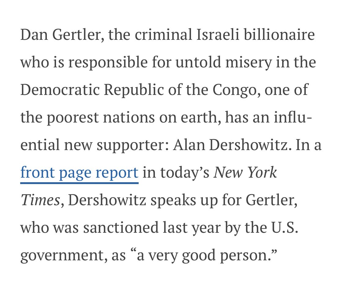 “Celebrity defense attorney Alan Dershowitz and former FBI Director Louis Freeh have registered to lobby the U.S. government on behalf of an Israeli businessman, Dan Gertler, who has been accused of getting rich from corrupt mining deals in Africa.”