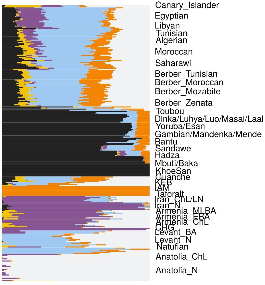 حيث تلعب دور الوسيط Proxy للأصول الأفريقية الشرقية (الغير محددة) بعينات تافوغالت (عند K=10)