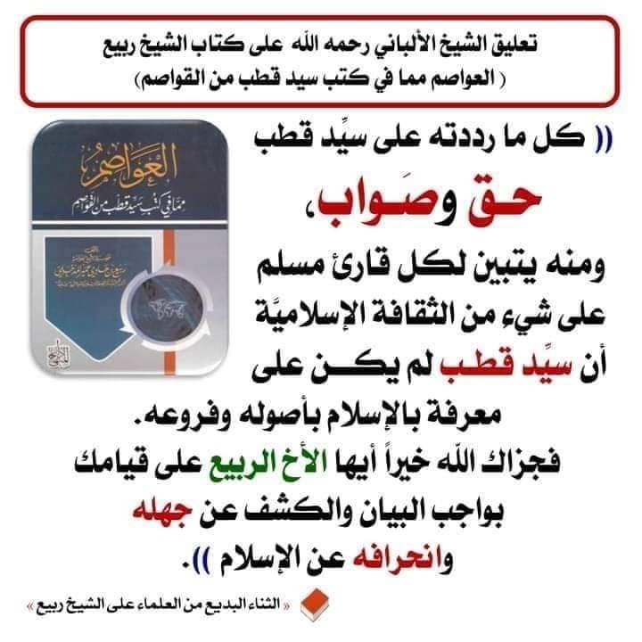 وهل تعلم أن العلامة ربيع المدخلي ألّف حوالي أربعة كتب أو أكثر من أبرزها كتاب(العواصم مما في سيد قطب من القواصم)في الرد على #سيد_قطب ومنهجه وعقيدته الباطلة وبيّن فيها أخطائه من كتبه ورد عليها بالدليل والبرهان؛وقد أقرّ له العلماء بذلك وأثنوا عليه ومنهم الإمام الألباني رحمه الله؟ =