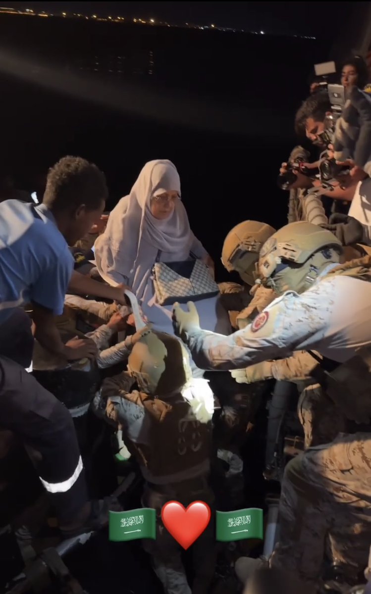 هي سعودية كانت في زيارة لأقارب لها قبل أن تعلق في الخرطوم بين الضرب والنيران، ولكي تصل إلى هنا قطعت مئات الكيلومترات، واستقلت كل وسائل المواصلات المتاحة من قطار وسيارة وباص، حتى وصلت أخيراً ليحملها أبطالنا على كفوف الراحة وكأنھا تماماً أماً لهم.