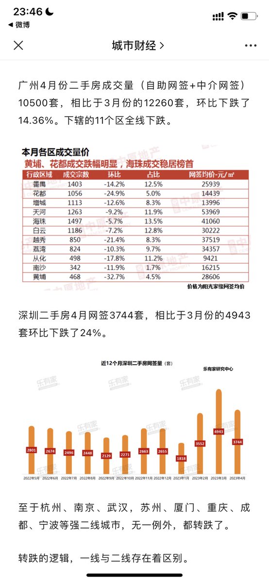 这篇《一线楼市集体下跌》的文章太棒了,详细列出了北上广深4月份的成交量和跌幅。北京环比下跌40.5%,上海跌26%,广州跌14.36%,深圳跌26%。