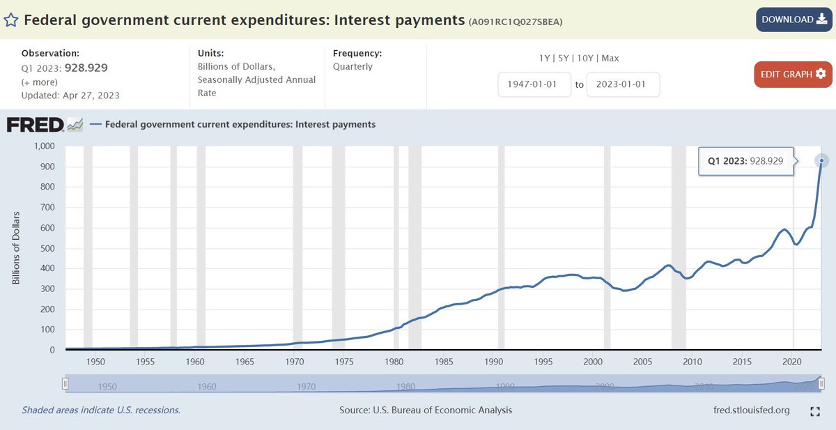 3.如果通胀迫使美联储必须不断加息,利息支出必然迅速上升,联邦政府就必须大幅度提高债务上限,靠增加借钱来还利息。