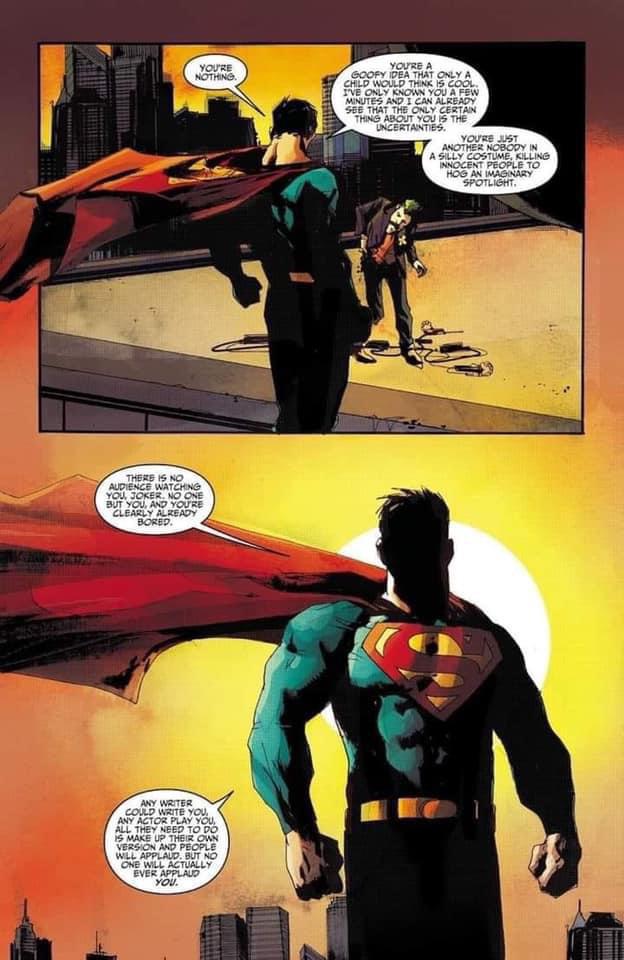 6- من الجانب الاخر نرى ان سوبرمان حامل السلام ، البطل الذي يأتي بنور في وسط الظلام العاتم لديه جانب لا يمكن القول عنه سيء لكنه خطير يوضح هل امر في احدى الكومكس الذي قام سوبرمان بأمساك الجوكر و كان قد أهان الجوكر و استفزه بأنه فعل كل شيء يمنع الجوكر من اتمام جريمته
