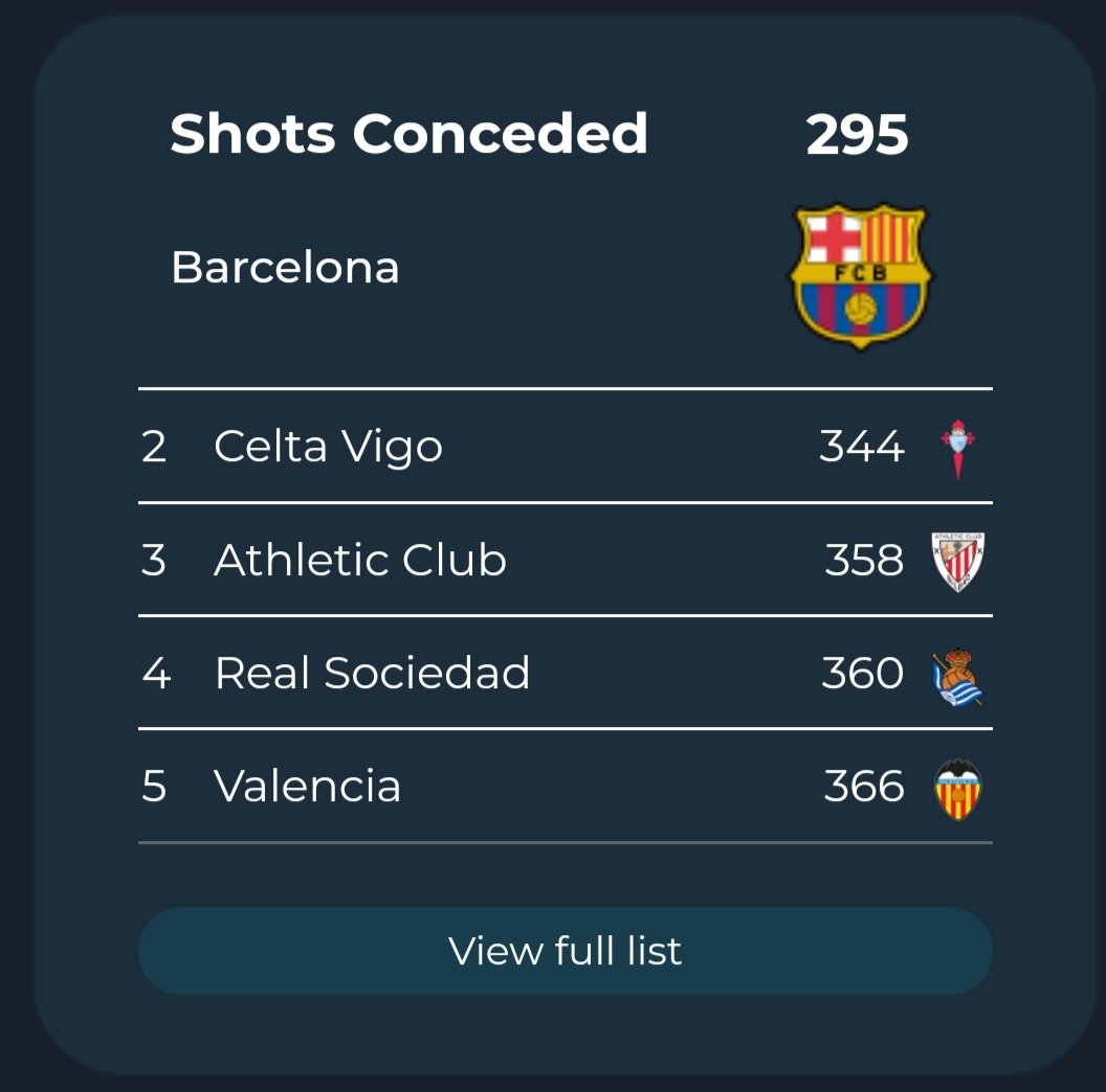 - Shots Conceded = 295 ( الأفضل)