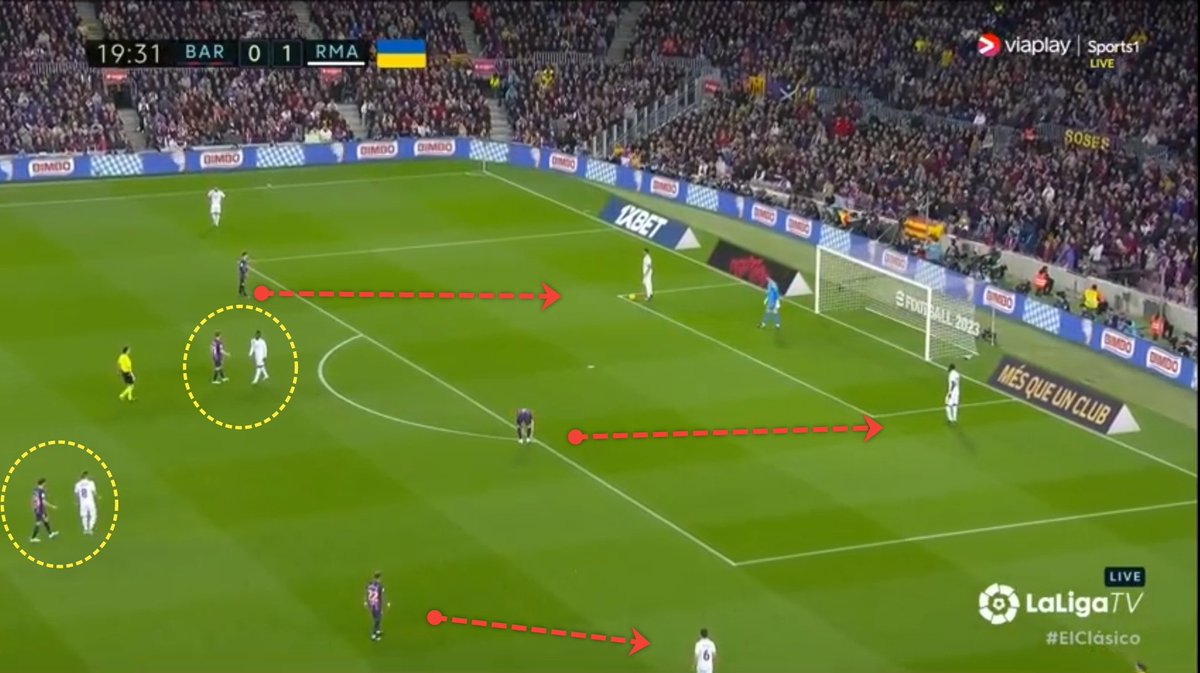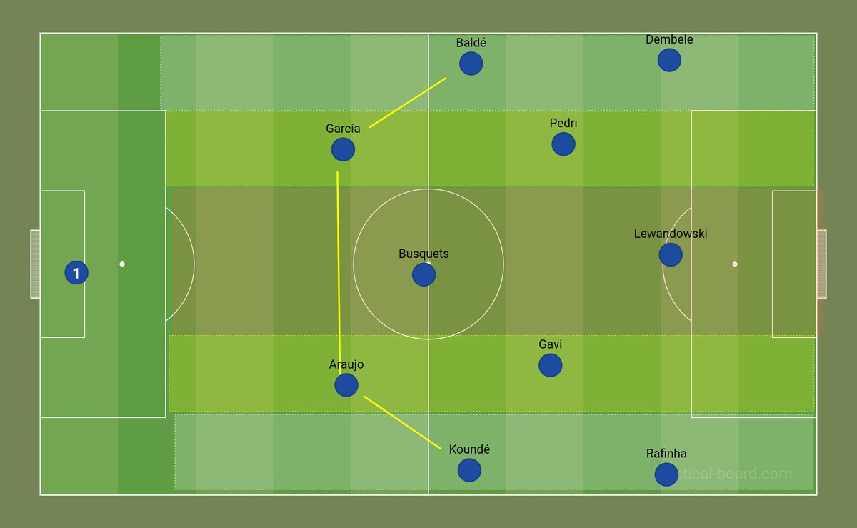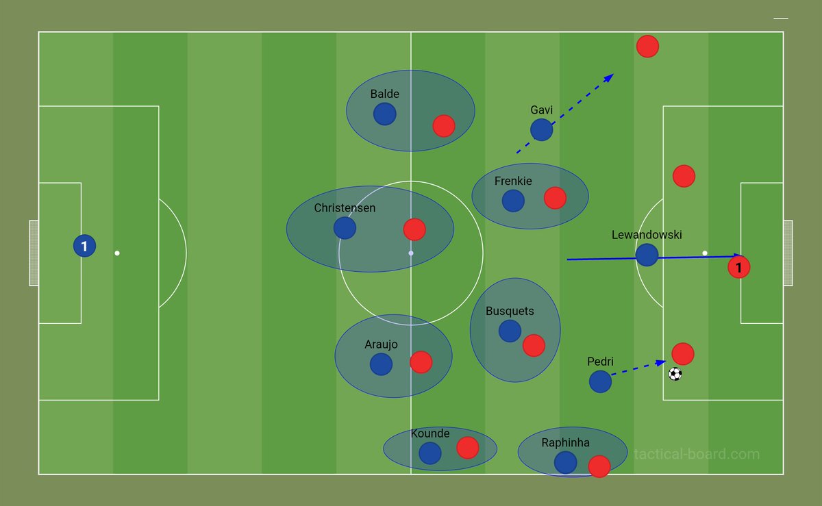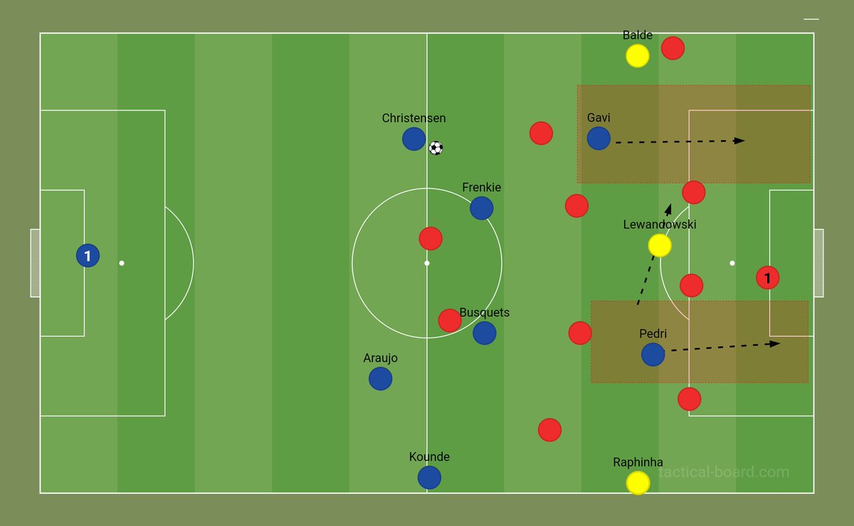 - رافينها ، ليفاندوفسكي ، بالدي بدرجة أقل : لتثبيت خط دفاع الخصم بهدف منح أمتار إضافية لكل من بيدري و جافي في أنصاف المساحات