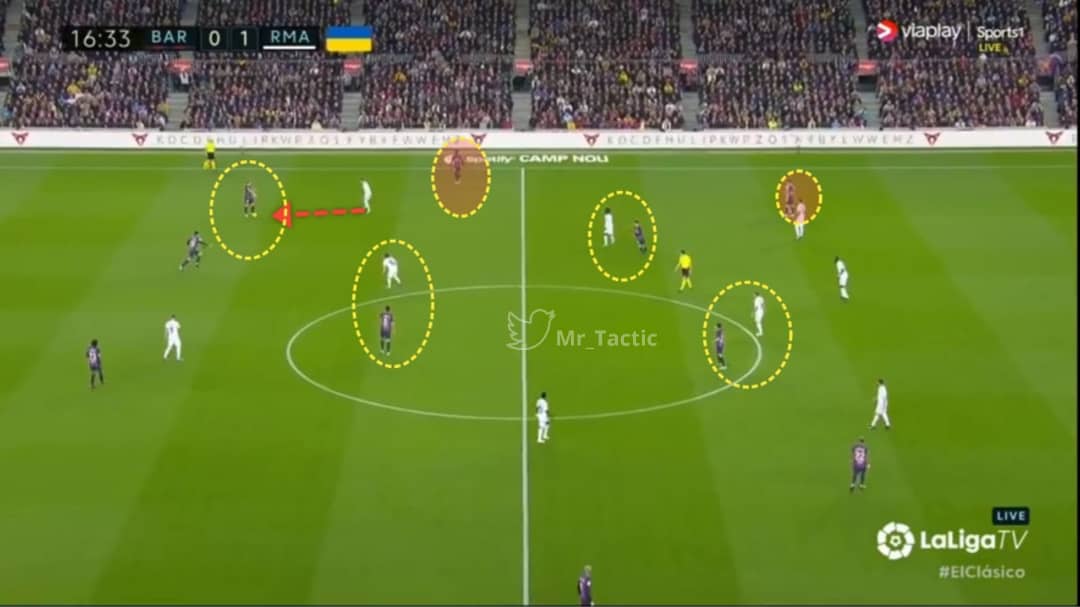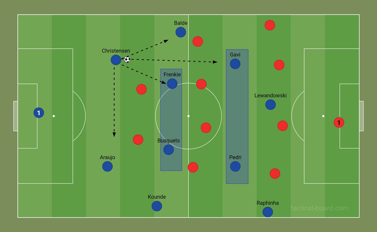 🔻 في حال كان ضغط الخصم عاليا : يعتمد #برشلونة على مجموعة من الجمل التكتيكية لعل أبرزها فكرة الرجل الثالث بمشاركة قلبي الدفاع و خط الوسط بالإضافة لليفاندوفسكي